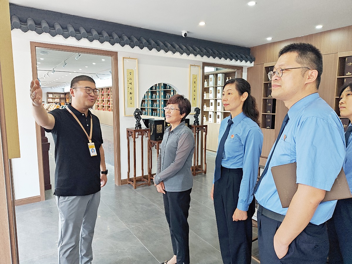 劉繼英一行在金不換集團(tuán)黨委書記、總裁支濤的陪同下,實(shí)地查看了金不換白酒儲(chǔ)藏、銷售、生產(chǎn)、文化展示基地。聽取企業(yè)生產(chǎn)經(jīng)營(yíng)情況和發(fā)展規(guī)劃介紹。劉繼英檢察長(zhǎng)對(duì)金不換多年來(lái)堅(jiān)持守法誠(chéng)信經(jīng)營(yíng),創(chuàng)造良好生產(chǎn)經(jīng)營(yíng)環(huán)境,取得高質(zhì)量發(fā)展給予高度贊揚(yáng)。